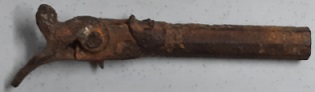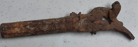 Suite à la demande du propriétaire d'un champs qui avait perdu une pièce de matériel agricole. Je me lance sur cette recherche et bingo un gros son ferreur, je creuse et très surpris de cette trouvaille, un pistolet à poudre noir ( je pense ) avec son chien en position chargé.