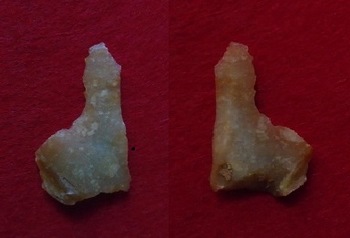 Pas de retouches si ce n'est une série de minuscules éclats à droite la face lisse (photo de gauche). La ''pointe'' semble avoir été cassée.