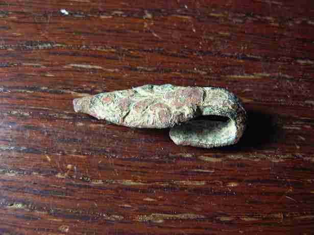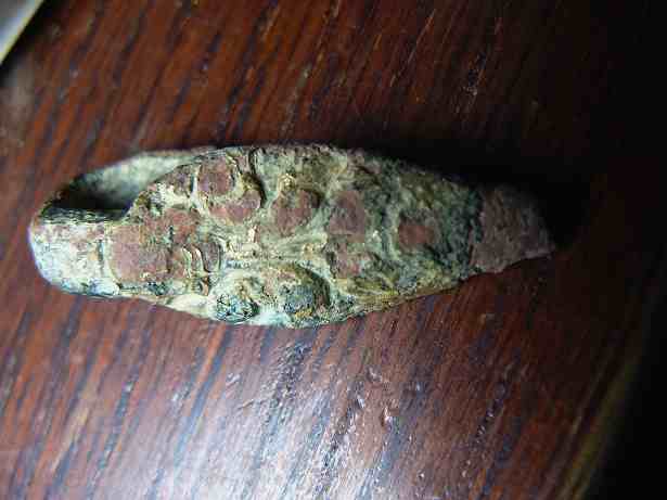 pouvez-vous m'identifier, ce que je pense être une agrafe, trouvée dans le 53, elle mesure 35 mm, est-il possible de dater ce genre d'artefact médiéval ? quel siècle ? on voit des restes de dorure dessus