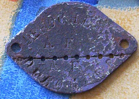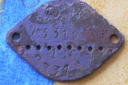 Ce qui m'intrigue sur cette plaque, ce sont les deux trous de chaque côté. En principe, la plaque est portée autour du cou, sur une chaîne, et n'a donc qu'un trou. Ce qui me laisse penser que ce n'est pas français.