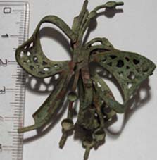 Bonjours je viens de trouver cette broche dans mon jardin et j'aurai voulu une datation approximative bien qu'elle ne doive pas etre tres ancienne vu qu'elle est assez travaillée. Le metal doit etre du bronze ou du cuivre et il y a deux petites pierres sur 4 a l'origine au milieu.