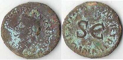 Que je ne trouve pas. En tout cas, il ne doit être ni de Tibère qui n'a jamais été germaniqué (c'est pas un gros mot) , ni de Caligula qui n'a pas d'as avec un tel revers. La pièce ferait plutôt penser à une monnaie de Germanicus, mais sur celles-ci GERMANICUS est en tête dans les légendes et non pas au milieu comme içi. Peut-être est-ce un as non répertorié dans le Cohen ou un faux d'époque à la légende fantaisiste.