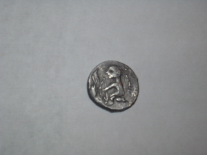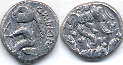 la pièce semble grise /est-elle en argent ou en soudure d'étain ? en tout cas elle est fortement inspirée du bronze à l'arc et d'un bronze ambien aux loups tête bèche / le probleme reside dans l'association des deux faces qui est unique. Plaisanterie moderne ? antique ? ou rareté extrême ? faudrait voir !