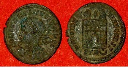 Revers : PROVIDETIAE CAESS, 'A la providence de nos deux césars'; porte de camp surmontée de tourelles et d'une étoile; dessous, STR (atelier de Trèves).