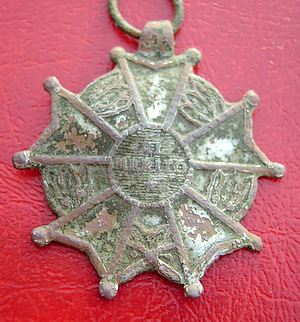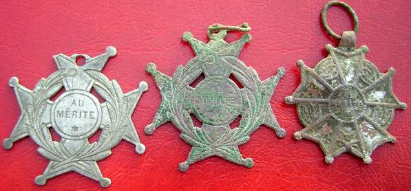 Notre ami robert44 m'a expliqué que ces médailles étaient données à l'école aux enfants 'méritants' dans les années 50. je n'en sais pas plus pour l'instant, mais ce qui est sympa c'est que je gratouille la troisième à droite trouvée cet été ,et je découvre l'inscription 'al Mérito'