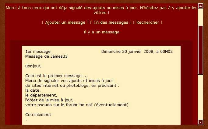 Je vous demanderait donc, quand vous aurez une minute de passer signaler dans une fiche en deux lignes ce que vous avez ajouté et quand, et, bien sûr de renseigner une nouvelle fiche quand vous faites un ajout ou mise à jour. Faites au mieux pour que les visiteurs (plus d'une 15aine par jour) sachent directement ce qu'il y a de différent depuis leur dernière visite et soient tentés de revenir de temps à autre voir les nouveautés !