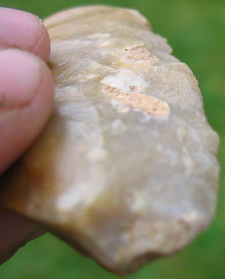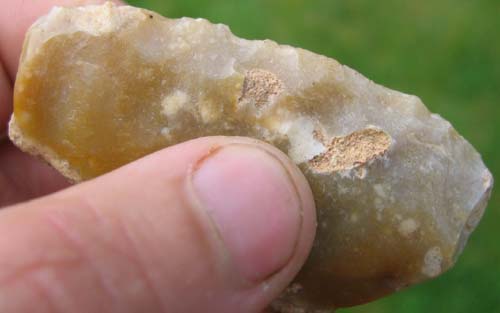 voici un outil en silex trouvé dans le 53, il mesure 6cmx3cmx1cm d'épaisseur, tout la partie haute est retouchée même si ce n'est pas hyper visible sur la photo.