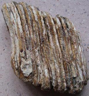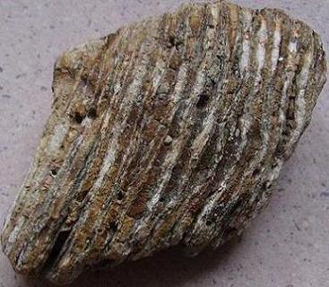 Il s'agit bien d'un morceau (oui, d'un morceau) de dent de mammouth. Attention,ce type de fossile trouvé en baie de Seine est gorgé de sel et s'éclate avec le temps. Il faut d'abord le baigner longtemps dans l'eau distillée pour en dissoudre le maximum, puis lui faire faire un bain prolongé dans du styrène+acétone bien dilué pour que le produit pénètre en profondeur.