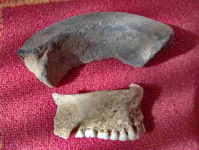 hiers tout en passant ma poele a frire dans un labour, j'ai rammasser sur quelques metres carrés pas mal de poterie de couleur noire ainsi que des debris de verre qui me semble anciens,voire romain ,le plus fort c'est la decouverte d'une demi machoire humaine que je posterai a votre demande car je trouve ça un peu cracra.