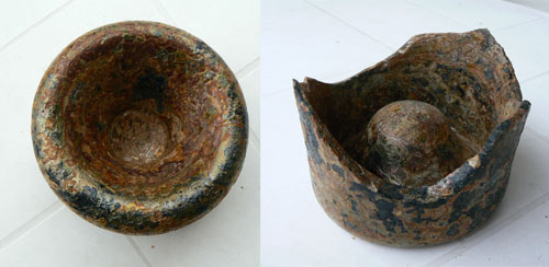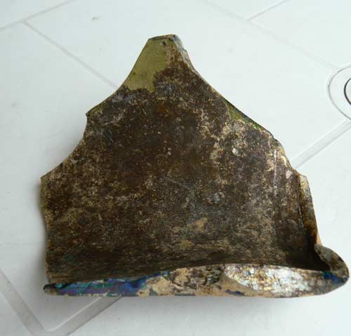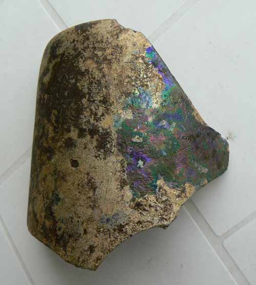 Merci pour toutes ces précisions. Effectivement le col est beaucoup plus évasé on dirait des carafes de décantation, pour la patine on reste sur les concrétions, cela n'est pas un effet décoratif? je fais suivre une photo ou le verre est complètement rongé, il reste juste un petit morceau d'iirisation et j'ai du passer un fixateur car la patine marron foncé partait au simple contact des doigts comme de la poussière de rouille.