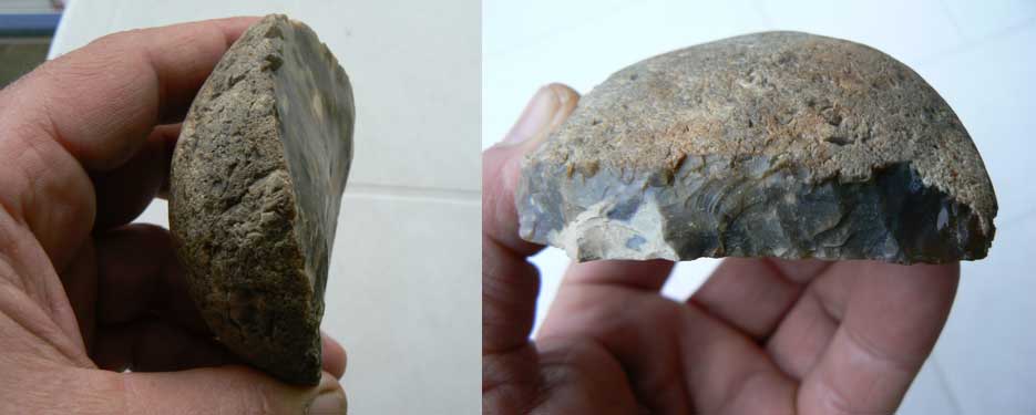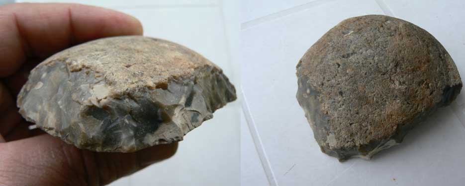 Vraisemblablement un premier coup pour faire cet éclat épais (presque une demi sphère)) puis des enlèvements sur une partie du pourtour pour en faire un grattoir ,qui lui est carêné naturellement de par son origine de galet plus ou moins sphérique.