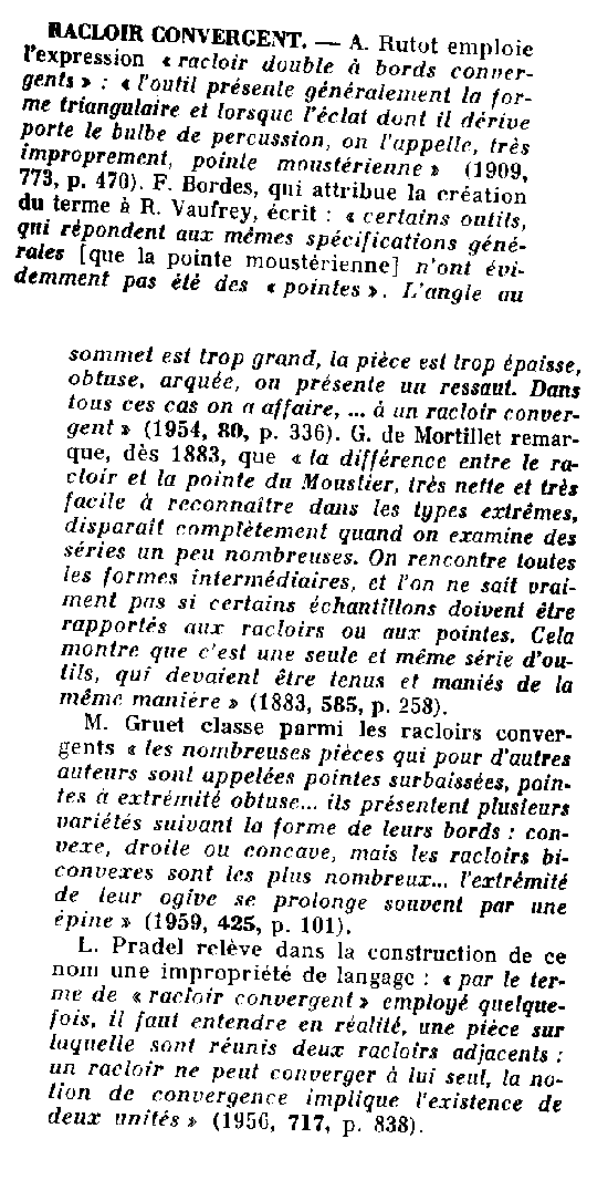 Voici un extrait par M. Brézillon sur le racloir convergent dans 'la dénomination des objets de pierre taillée'. Beaucoup d'auteurs préhistoriens ont débattu également sur la pointe moustérienne et pseudo moustérienne...