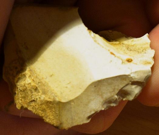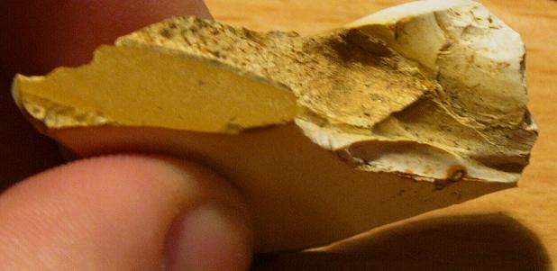 Pourquoi, pas un outil ? Eh bien parce que pour être typologiquement admis dans cette catégorie, il faut, ou bien un type sans équivoque (hache, tranchet, pic, lame, ...) ou, s'il s'agit d'un éclat anthropique, comme je le pense ici, il n'est qualifié d'outil que s'il a des retouches, ce qui en fait alors un grattoir, un racloir, un denticulé, et plusieurs autres dénominations selon que les retouches sont comme-ceci ou comme-cela.