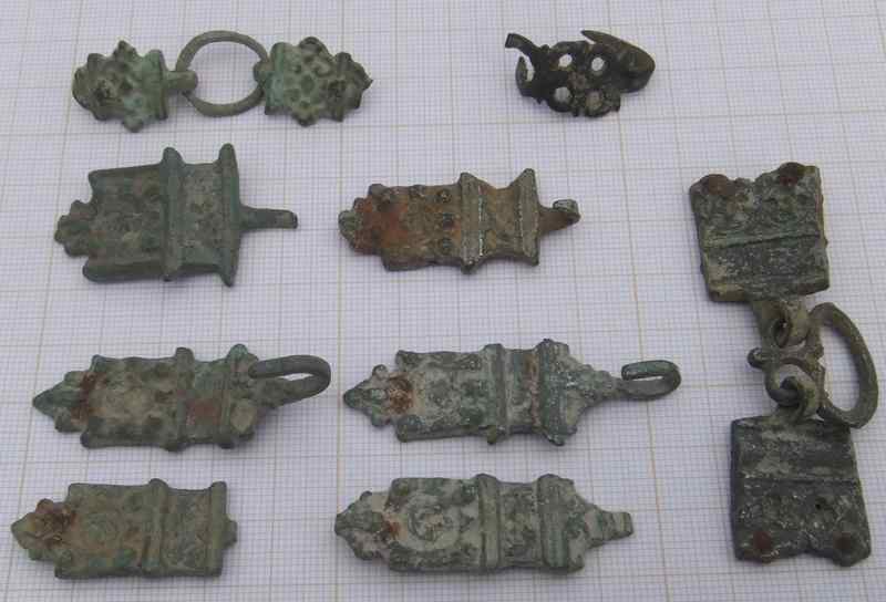 Mors de demi-ceint postmédiévaux en alliage cuivreux avec pour certains des restes d'étamage. Tous trouvés en Côte d'Or.
