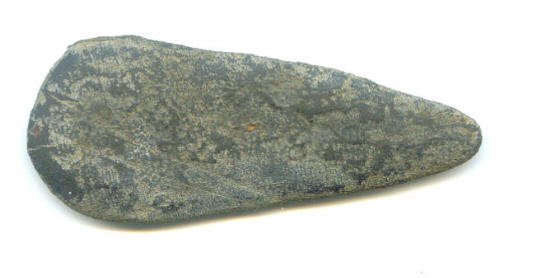 Bonsoir Aculéum, Bien que je la trouve assez atypique, comme Celo c'est bien une hache polie néolithique. La pierre n'a pas l'air trop dure, de plus elle n'est pas épaisse. Bizarre. Pourtant la partie tranchante a été intentionnellement affûtée et le talon n'a pas de trace de choc comme si c'était un ciseau.