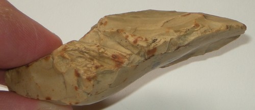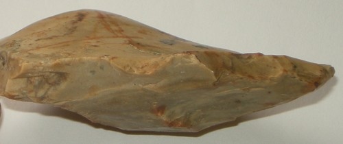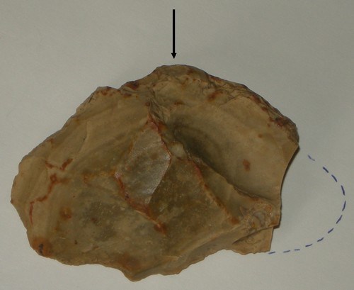 Voici un éclat avec un beau gros bulbe de percussion (au revers au niveau de la flèche). La partie en bas à droite est cassée. On peut supposer que l'objet était à peu près symétrique.