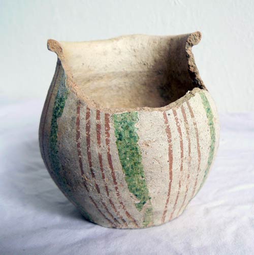 Ici il manque le rebord qui permettrait de savoir si c'est bien un 'chamber pot' ou un pichet. Puis je n'arrive pas à voir sur les clichés si la couleur de fond grise est un grésage ou la couleur brute.