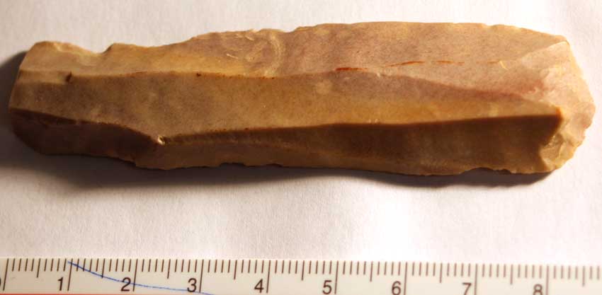 Bien qu'ayant la forme d'un grattoir en bout de lame, cet objet est finement retouché sur ses tranchants qui sont particulierement efficaces.