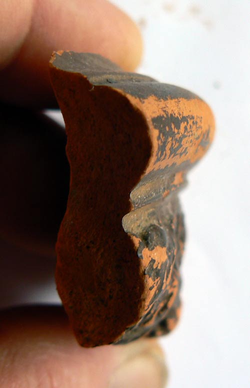 J'ai trouvé ce tesson récemment, mais j'en avais trouvé un autre vers le mois de Mai l'année dernière que j'avais posté (n° 66302 ) licaunais y disait avoir trouvé de la sigillée tardive décoré à la mollette dont l'engobe ressemblait à celui-ci et Thierry31 pensait que cela pouvait être de la campanienne . Le débat en était resté là donc je le relance avec ce nouveau tesson. Merci pour vos avis.