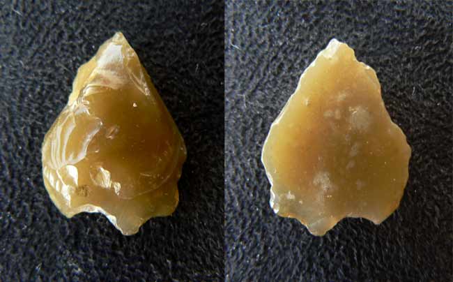 Trouvé ce petit silex blond de 25 mm de hauteur par environ 15 mm de large,il me fait penser à une petite armature dont un morceau aurait été brisé ( R1) et réaménagé en petit gratoir, on y voit deux petites retouches.