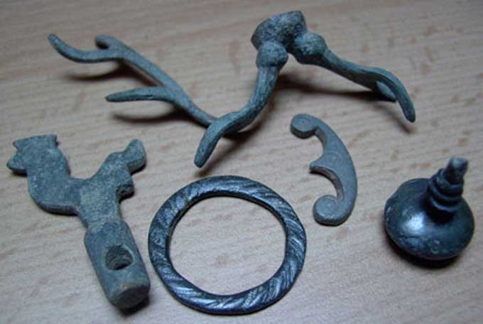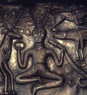 J’ai déjà trouvé un morceau pareil. Peut-être une parure de statue votive représentant le dieu celte Cernunnos, représenté aussi sur le chaudron de Gunstrup (foto) ?