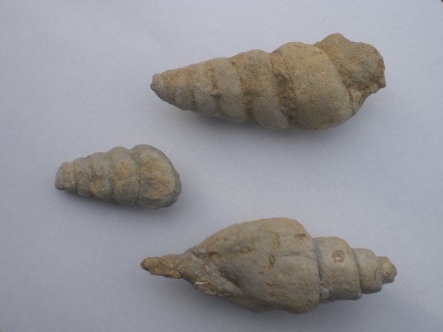 En R0, 3 moules internes de gastéropodes, les deux du haut Pseudomelania?, celui du bas Aporrhaidea (Pterocera?);