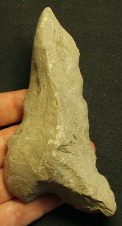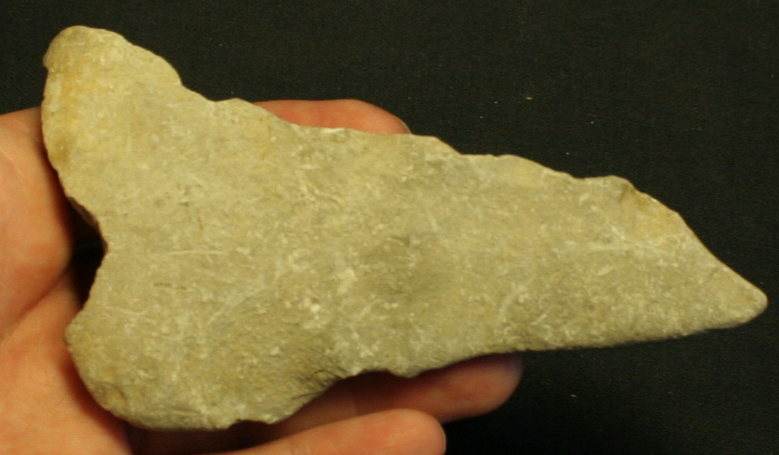 J'ai trouvé ce qui semble être un outil en forme de pointe en calcaire qui semble présenter des retouches en contexte paleo. A priori ce serait un racloir...