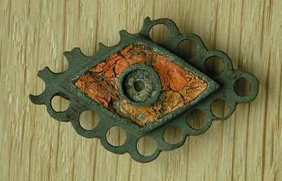 Belle pièce découverte ce week-end. Elle mesure 40 mm de long et 25 mm de large, émaillée orange avec certainement un bouton en os au centre qui a disparu. Au revers l'ardillon, qui a disparu, était retenu par un axe entre deux plaquettes. C'est toujours un plaisir à découvrir !