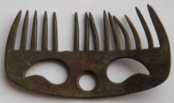 Je peux te confirmer avec quasi certitude que c'est un peigne à crinière pour chevaux, il doit être assez vieux car maintenant ils sont en plastique, il y a encore une dizaine d'années ils étaient en alu et avant en bronze ou fer.