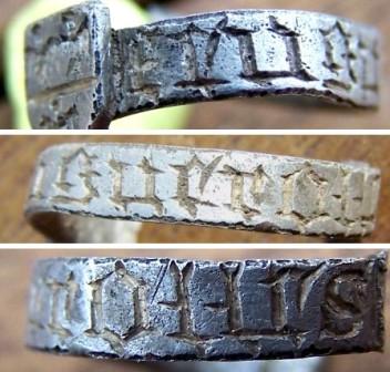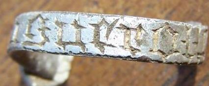 Jolie bague en argent médiévale, cassure ancienne, trouvée dans un sous-bois du 76. Diamètre 11 mm approximatif (petits doigts!!) si quelqu'u peut m'aider à identifier le blason et les inscriptions.... --------------------