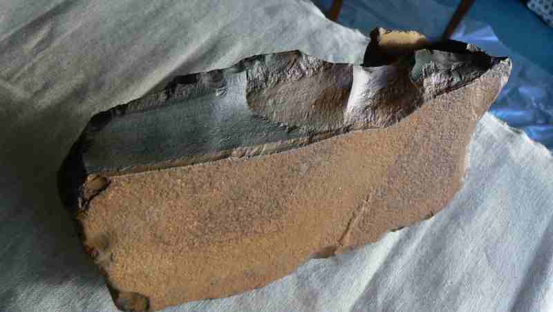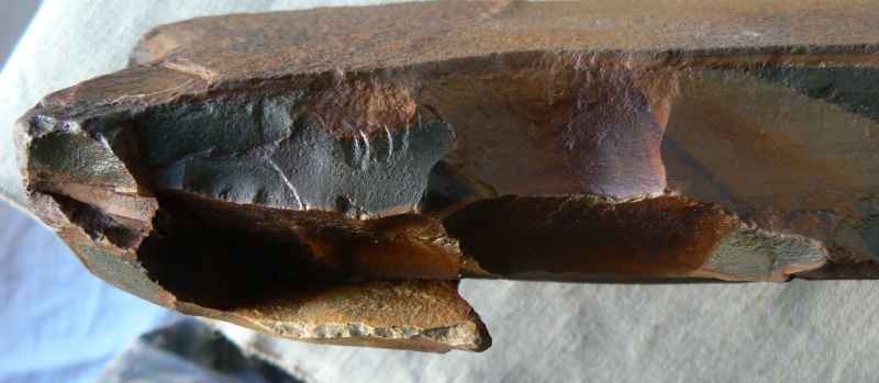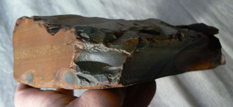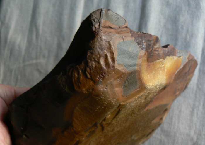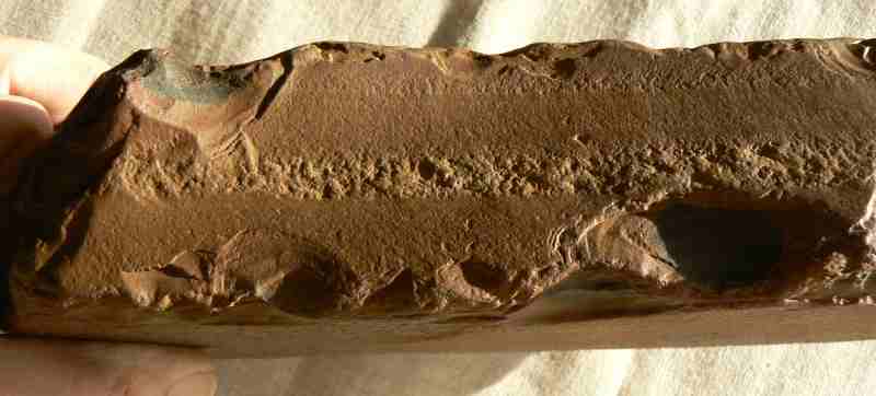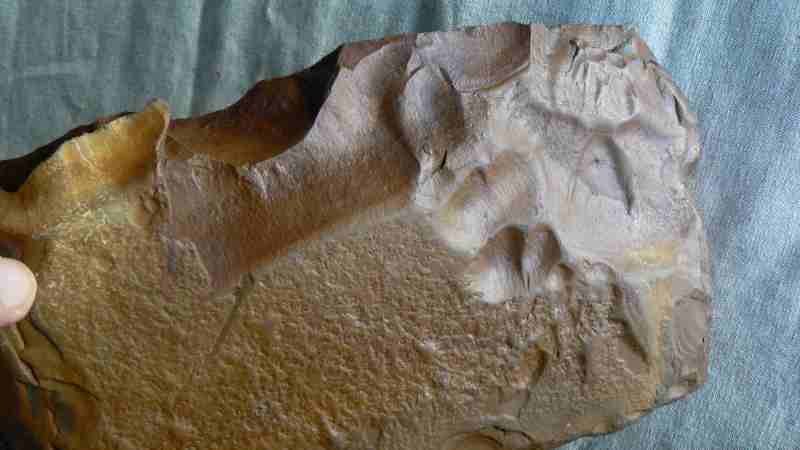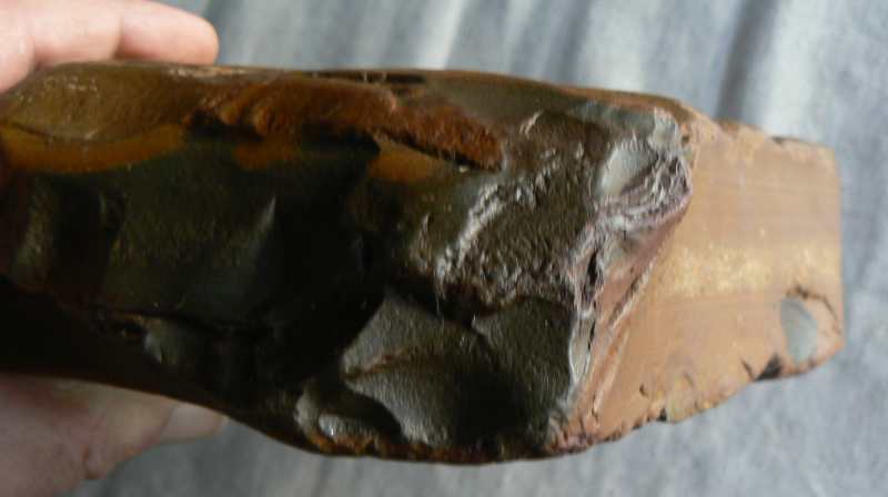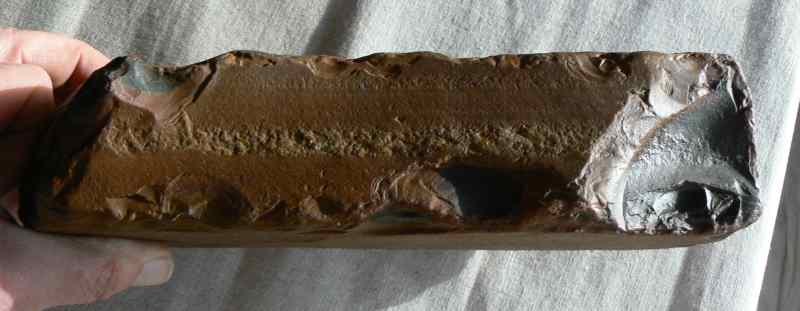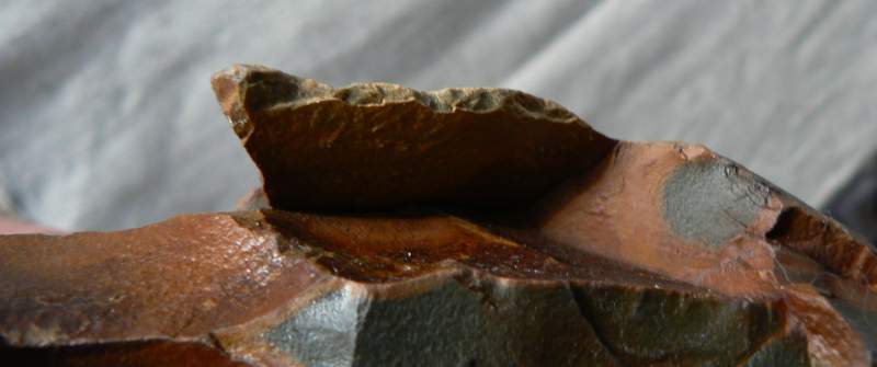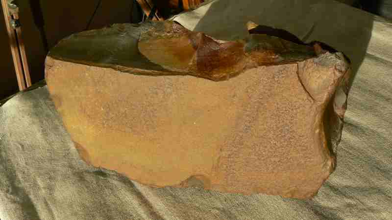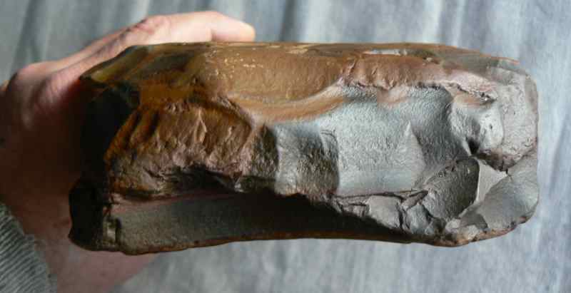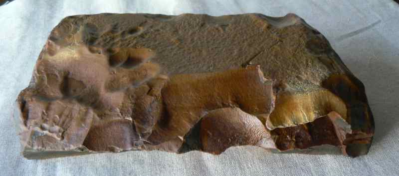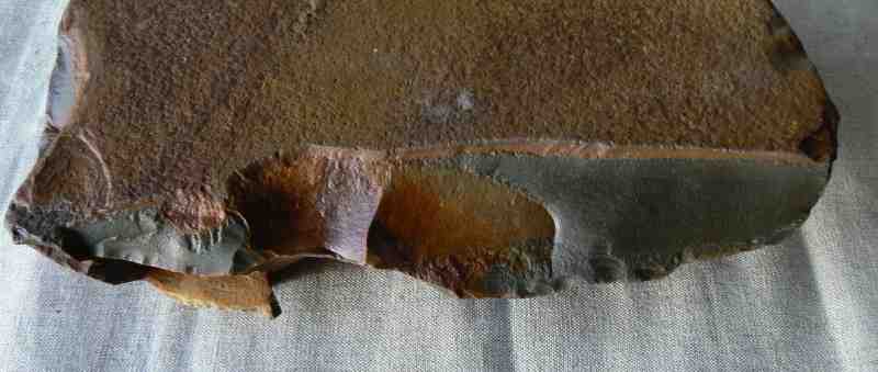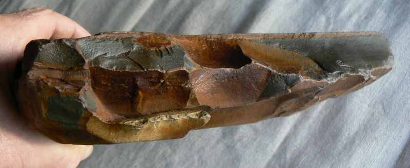 4Kg300 de quartzite (28cms par 16 et 6 d'épaisseur ! Ce cailloux à l'air d'être du même registre que celui du post 93457, sauf que là , on a plus a faire à une pierre plate aménagée qu'un énorme éclat. Vu les aménagements des côtés et du dos, il très confortable ergonomiquement. Comme l'autre pièce il tient bien sur sa base mais aurait pu être utilisé d'une façon verticale. Enfin, il y a cet sorte d'ergot dont le tranchant a été travaillé ? Merci pour vos avis.