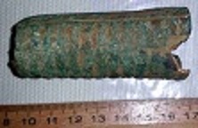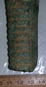Sortie ce week-end dans un champ de mon secteur, maintes fois fait, petites trouvailles dont une assez originale pour un tube (pas lisse) mais a la surface cannelée, parmi plusieurs objets ..., probablement en bronze avec une patine bien verte ...