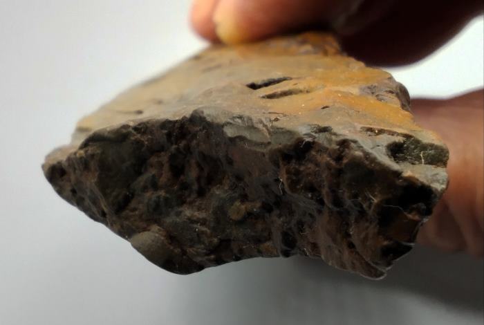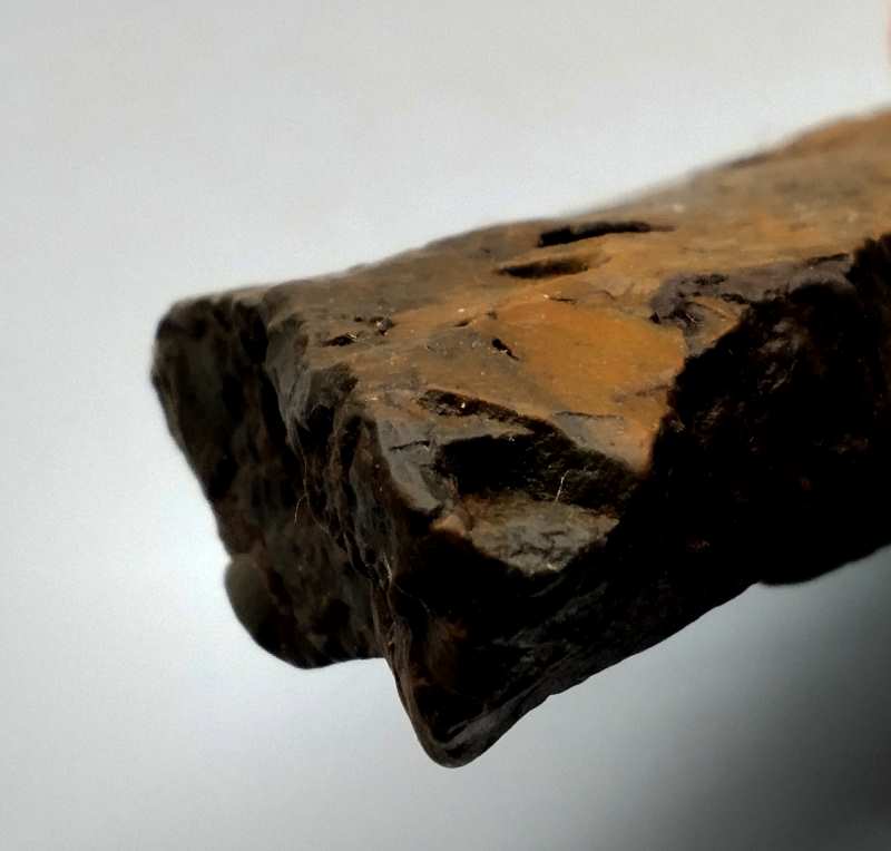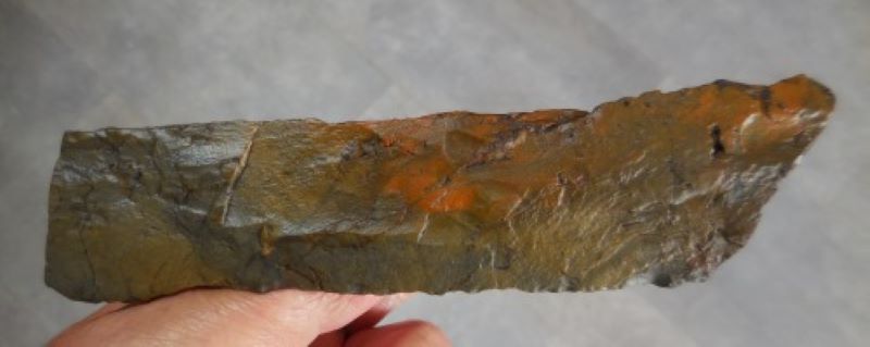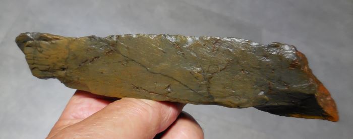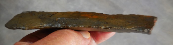 Comme je te le disais, en R2 on voit nettement deux enlèvements à chaque extrémité. Je joint deux photos, une qui fait voir le point de percussion et l'autre, le talon qui a une forme incurvé, la lame 'est pas plate.