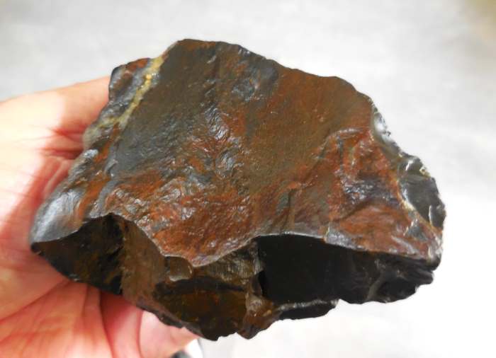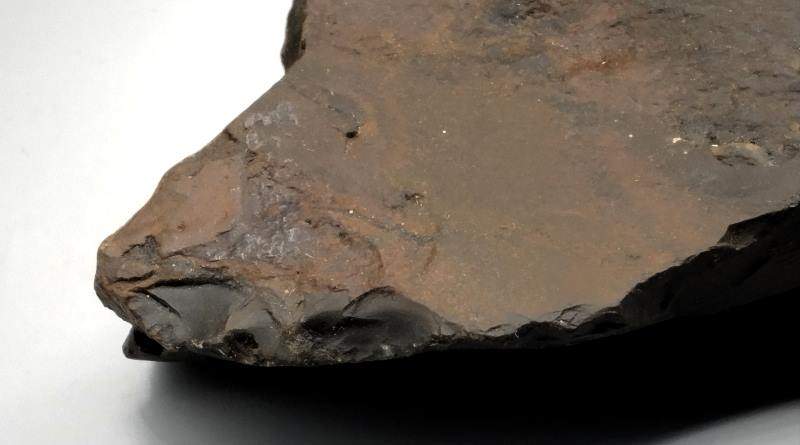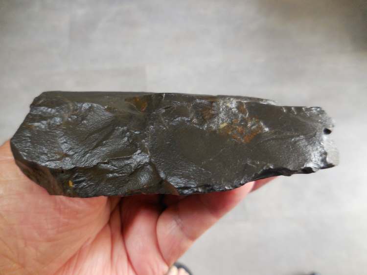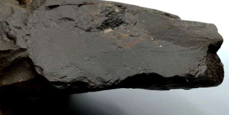 Je joint deux photos, la première montre les deux enlèvements droite gauche du tranchant et la seconde les retouches du revers du tranchant que j'ai omis de poster précédemment.