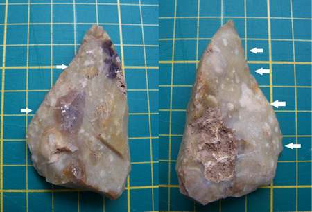 Je n'ai jamais vu d'objet de ce genre, pour autant que ce ne soit pas juste un déchet de débitage sans utilité particulière. On m'a parlé de racloir moustérien, ce qui à mon avis ne cadre pas avec le contexte local. L'idée du racloir m'irait bien, mais j'avais aussi pensé à un couteau ''à tout faire', bien que la facture soit plutôt assez brute. Si quelqu'un a une idée, je suis preneur. Merci