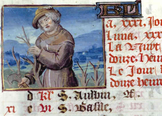 Taille de la vigne, dans les Heures à l'usage de Rome, fin XVe siècle, Ms 134, folio 3.