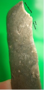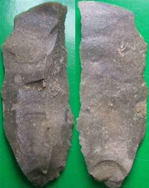 l'un des côté porte à son extremité deux petites zones retouchées alternativement sur une face et sur l autre hélas pas trop visible sur les photos
