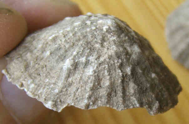 [161] et pour illustrer la cueillette des berniques, voici une ramassée sur un site de bouilleur de sel gaulois, donc de l'age du fer, elle porte nettement une échancrure faite par un couteau et non par un chopper