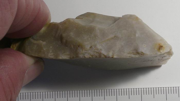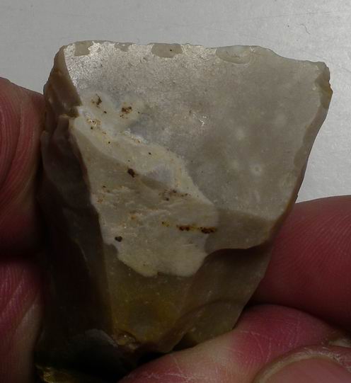 Il semble avoir été beaucoups utilisé , le réaffutage n'a pas permis de réaménager (d'ou son abandon ?) le coup du tranchet qui donne à cet outil toute son efficacitée. Son nez étant devenus trop épais et trop court.