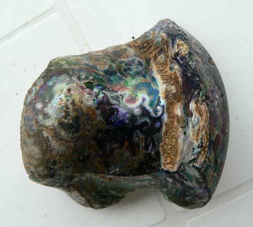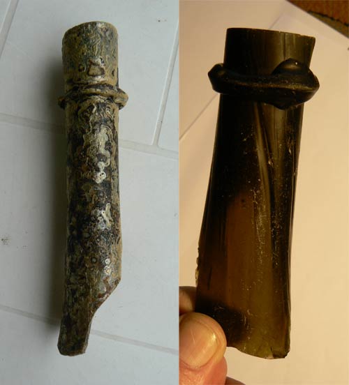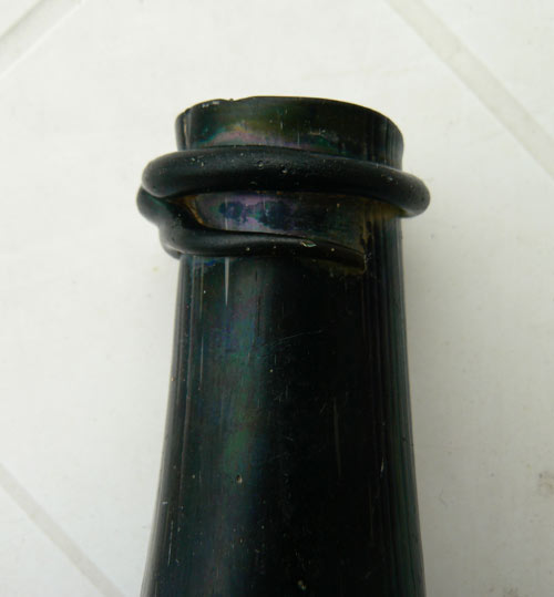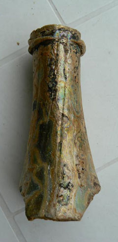 Merci pour toutes ces précisions. Effectivement le col est beaucoup plus évasé on dirait des carafes de décantation, pour la patine on reste sur les concrétions, cela n'est pas un effet décoratif? je fais suivre une photo ou le verre est complètement rongé, il reste juste un petit morceau d'iirisation et j'ai du passer un fixateur car la patine marron foncé partait au simple contact des doigts comme de la poussière de rouille.