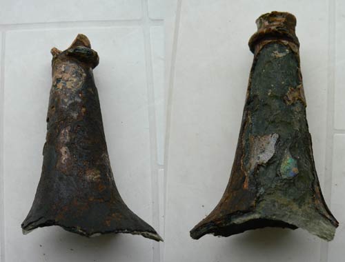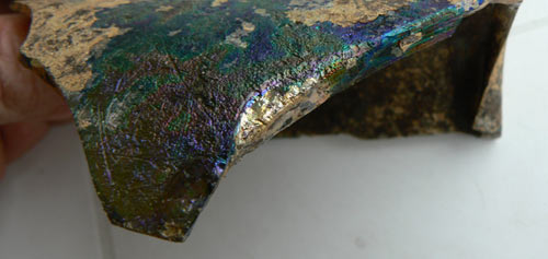 Sur les autres goulots effectivement l'anneau de verre est simple. Pour ce qui est de la patine, avant les explications de JCT post 65413, je pensais que les couleurs de l'arc-en-ciel était une sorte d'assiette, comme pour la dorure à la feuille, sur laquelle on aurait déposé cette patine un peu jaune et bronze.Je fais suivre quelques photos.